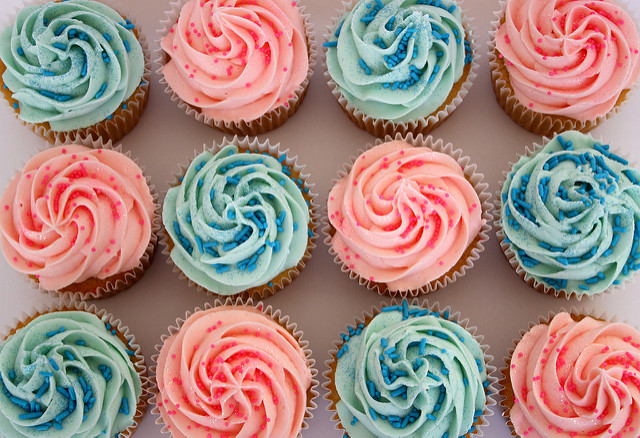 One day last week, after working for about an hour, I stepped away from my cubicle to fill up my water. I had barely set foot into the break room, when I stopped, momentarily frozen. There it was, on the far dining table: a large, square container, filled with cupcakes. Normally, such a sight would be most welcome. I mean, who doesn’t like a lunchtime cupcake, especially a free one? But even from a distance, I could easily see that these cupcakes were iced, alternately, in pink and blue frosting.
