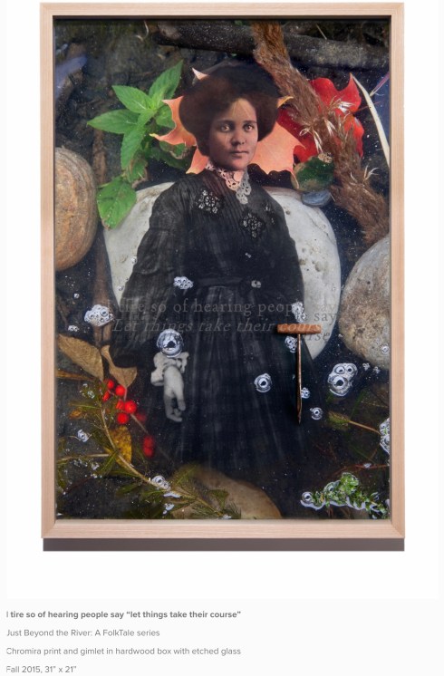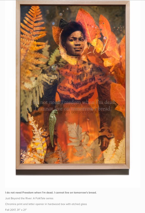 To make her pieces for this collection, Harris used photographs collected from various sources. She made transparencies of the photographs, then curated distinct backgrounds in water, using multiple found objects. Laying the photo transparencies on the water, Harris took photographs–the background objects showing through the photo transparencies, becoming one layered image. Last, the new photos were put into shadow boxes, along with other found items, behind glass that had been etched with the words of figures who were active during the Harlem Renaissance period.